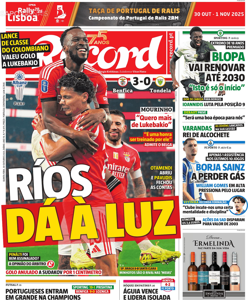 Já o jornal 'Record' sublinha o lance de Richard Ríos, que deu origem ao golo de Dodi Lukebakio.