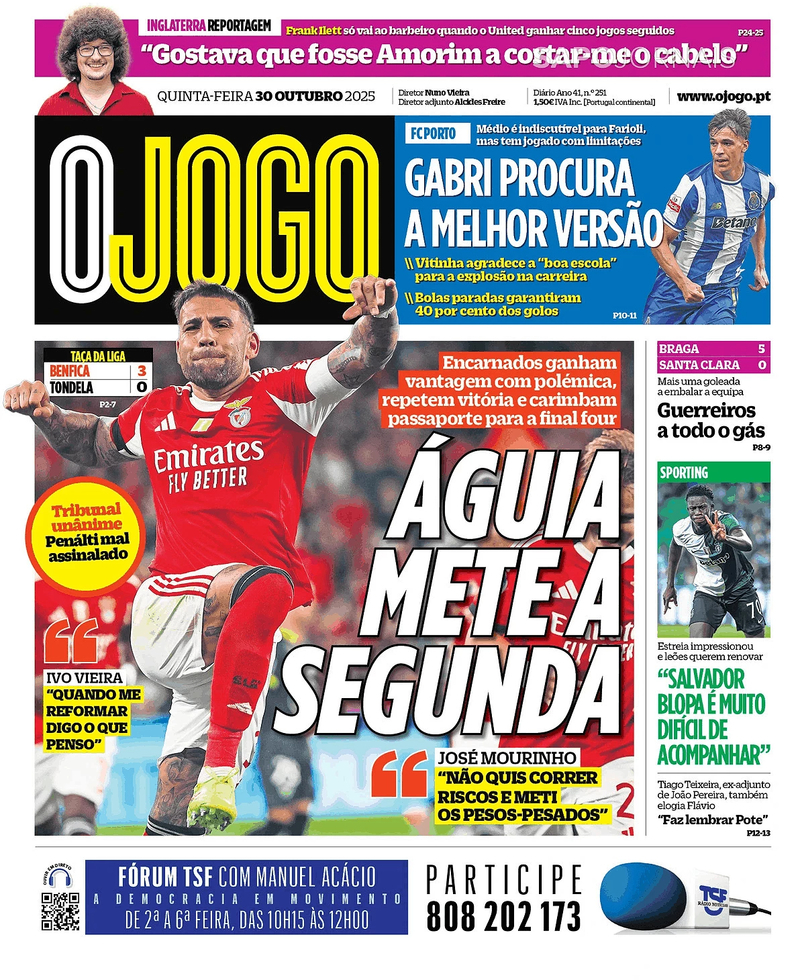O jornal 'A Bola' realça o golo apontado por Nicolás Otamendi, naquele que foi o seu jogo 250 com a camisola dos encarnados.