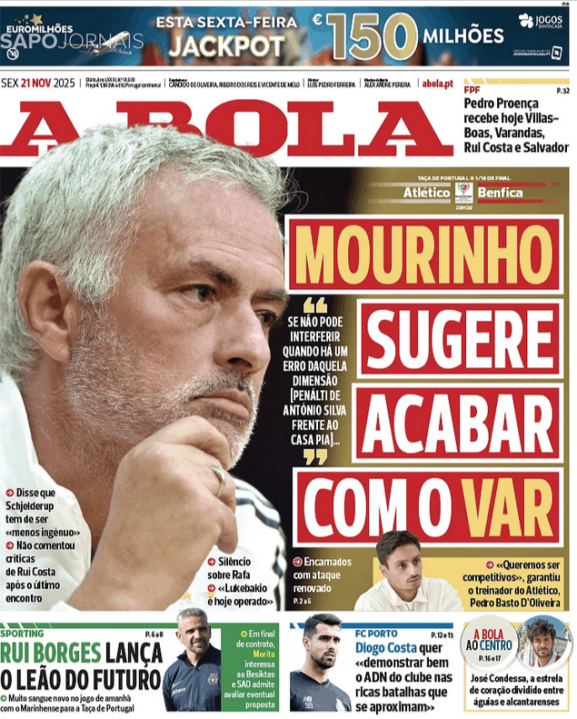 "Mourinho sugere acabar com o VAR", titula o jornal A BOLA, fazendo eco das palavras do treinador do Benfica na conferência de imprensa de antevisão ao encontro desta sexta-feira com o Atlético CP. "Se não pode intervir quando há um erro daquela dimensão…", cita.