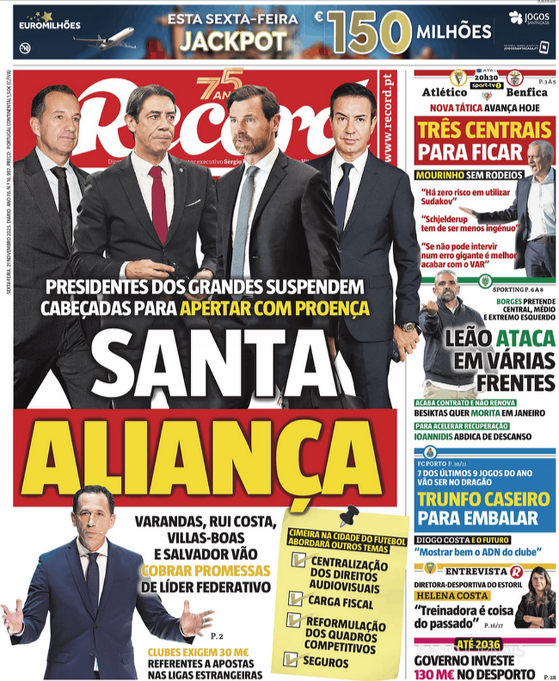 Já o jornal Record apresenta em destaque uma foto de André Villas-Boas, Rui Costa, Frederico Varandas e António Salvador e fala numa "Santa Aliança", explicando que os "presidentes dos grandes suspendem cabeçadas para apertar Pedro Proença", pretendendo "cobrar promessas do líder federativo".