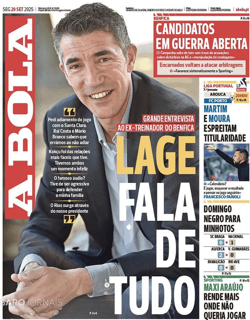 "Lage fala de tudo", titula A BOLA no lançamento da sua grande entrevista ao ex-treinador do Benfica.