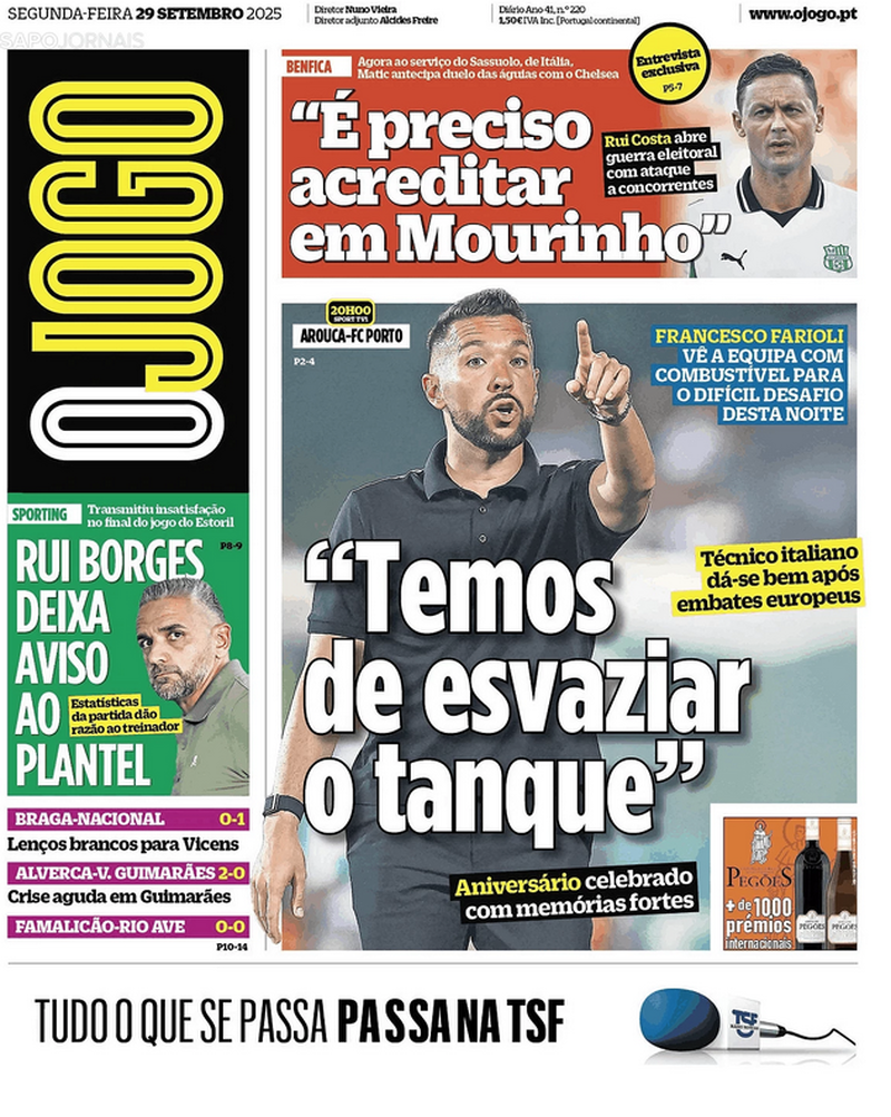 Por fim, o jornal O JOGO cita a mensagem de Francesco Farioi antes de mais uma partida do FC Porto: "Temos de esvaziar o tanque".