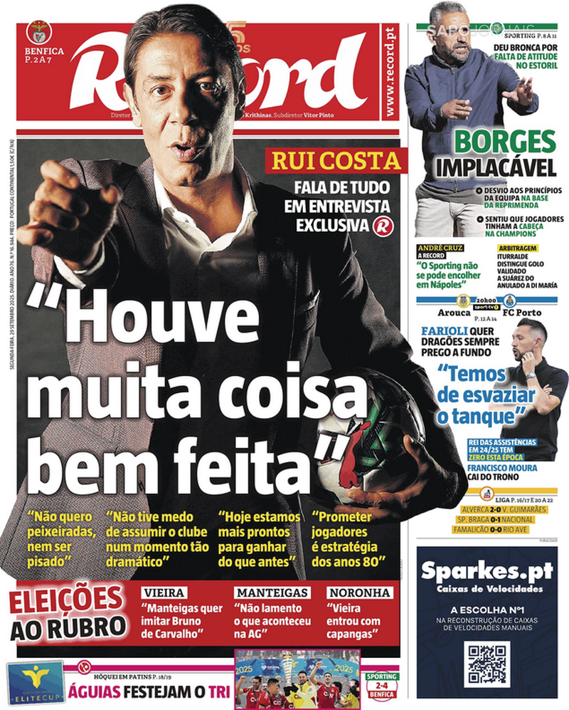 "Houve muita coisa bem feita", é a garantia de Rui Costa citada pelo jornal Record da sua entrevista exclusiva com o presidente dos encarnados.