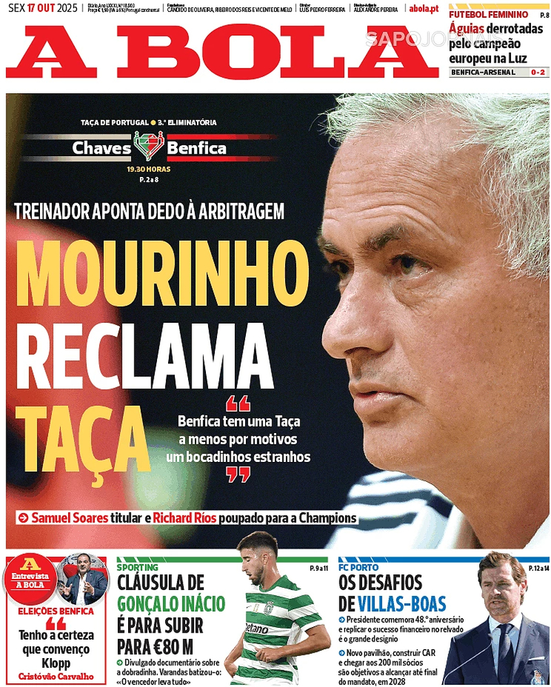 A imprensa desportiva desta sexta-feira incide exclusivamente na atualidade do Benfica. O jornal 'A Bola' foca-se nas declarações de José Mourinho na antevisão do jogo com o GD Chaves, onde deixa críticas à arbitragem da última final da Taça diante do Sporting.