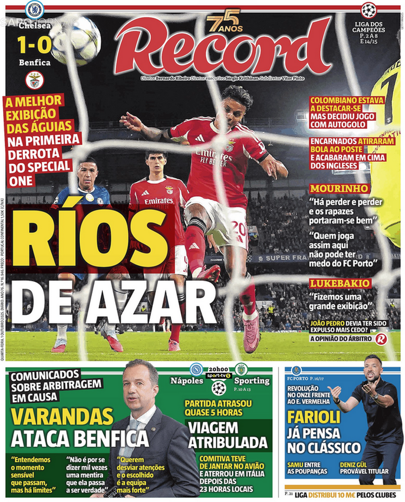 Já o jornal Record fala em "Ríos de azar", mas destaca que foi "a melhor exibição das águias, na primeira derrota do Special One'.