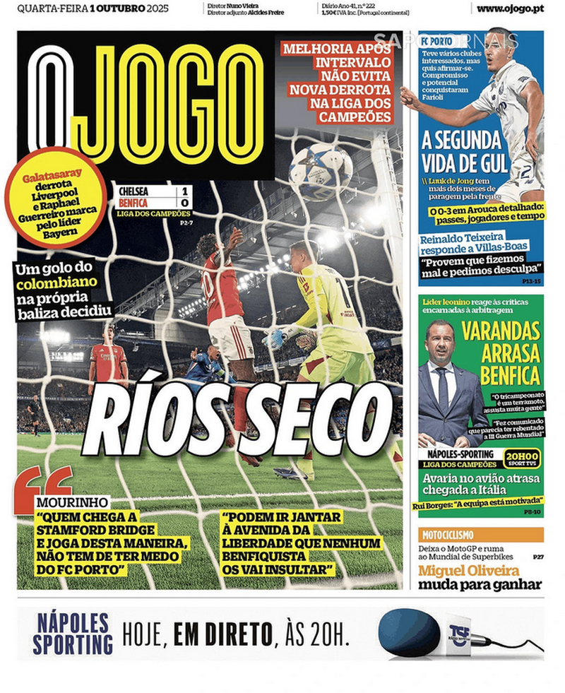 Por fim, o jornal O JOGO também destaca a infelicidade do médio, sob o título "Ríos seco", resumindo que "um golo do colombiano na própria baliza decidiu" o encontro.