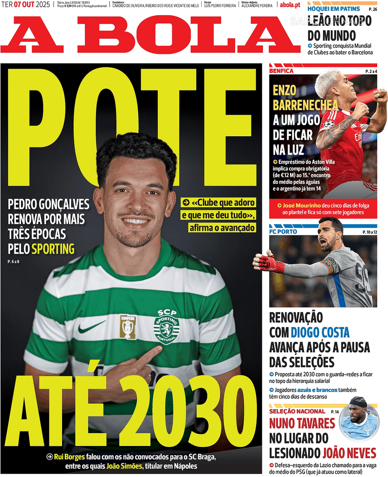 O jornal 'A Bola' dá conta da renovação de contrato de Pedro Gonçalves com os bicampeões nacionais por mais três temporadas.