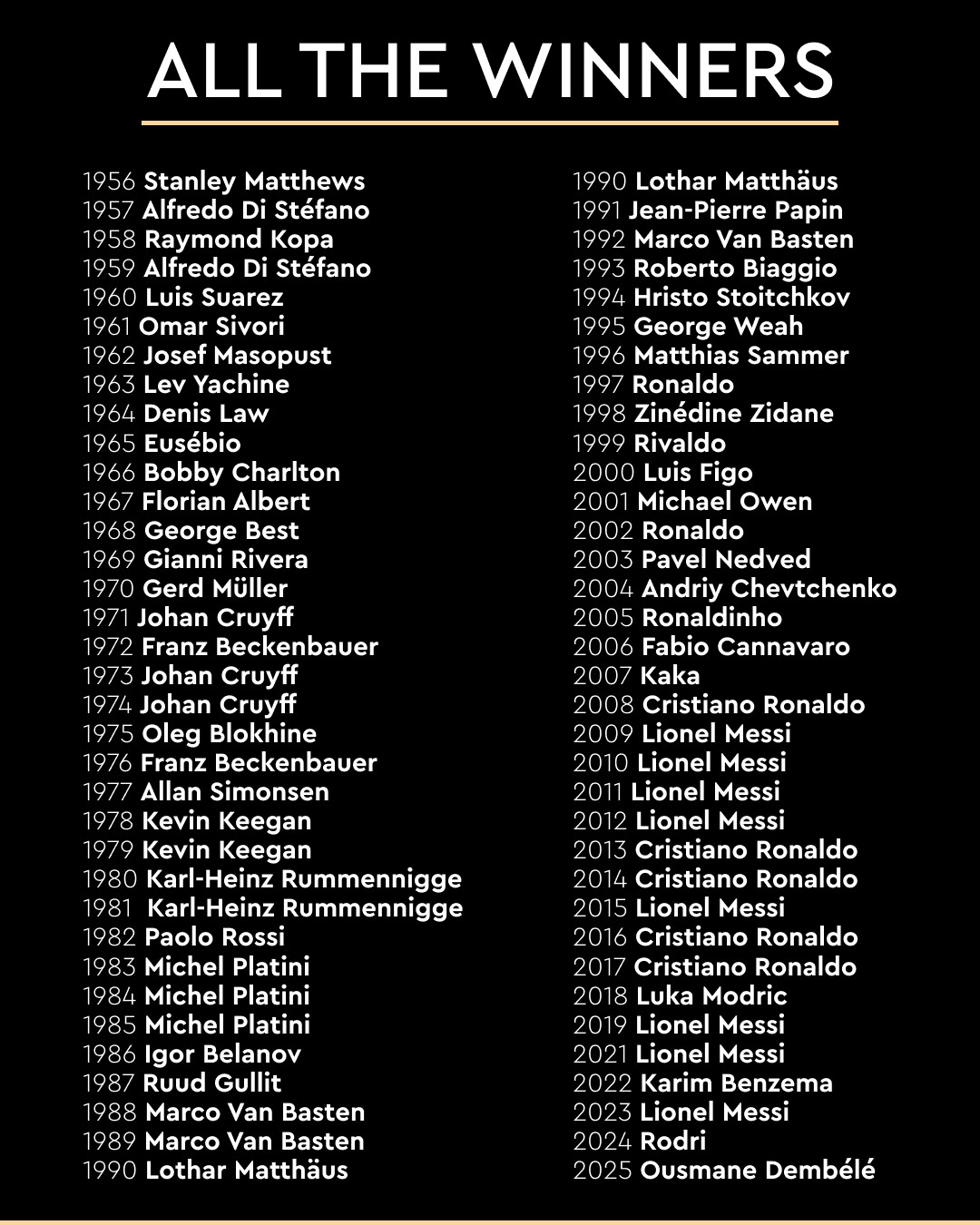 Todos os vencedores da Bola de Ouro da 'France Football'