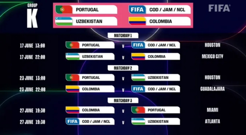 Inserido no Grupo K, juntamente com Colômbia, Uzbequistão e com o Vencedor do Playoff Intercontinental 1 da FIFA (que envolve Jamaica, Nova Caledónia e Congo), Portugal vai então começar por defrontar precisamente o Vencedor do Playoff 1 da FIFA pelas 18h00 de Lisboa de 17 de junho, em Houston. No mesmo local, a 23 de junho, também às 18h00 de Lisboa, terá lugar o embate com o Uzbequistão.