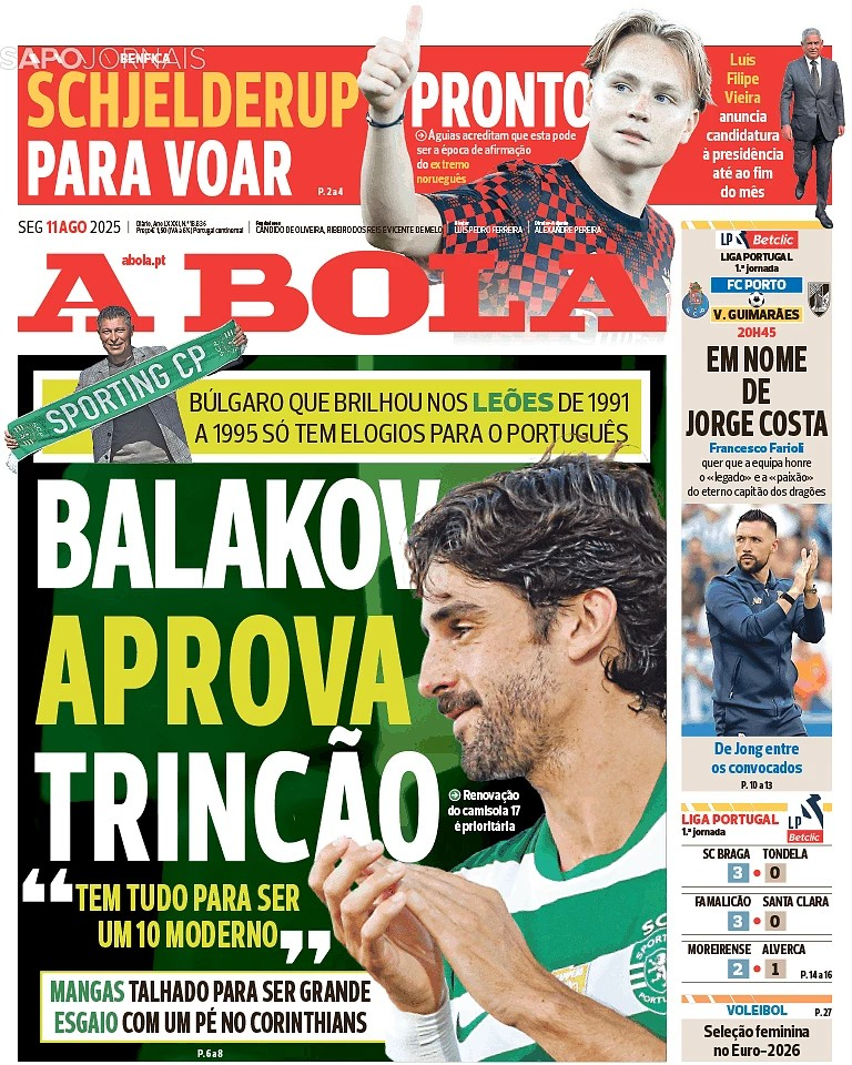 A Bola dá grande destaque a uma frase de Balakov sobre Trincão e garante que Schjelderup está pronto para voar no Benfica. Em nome de Jorge Costa, é outro destaque, em referência a receção dos azuis e brancos ao Vitória minhoto, esta noite, no Dragão.
