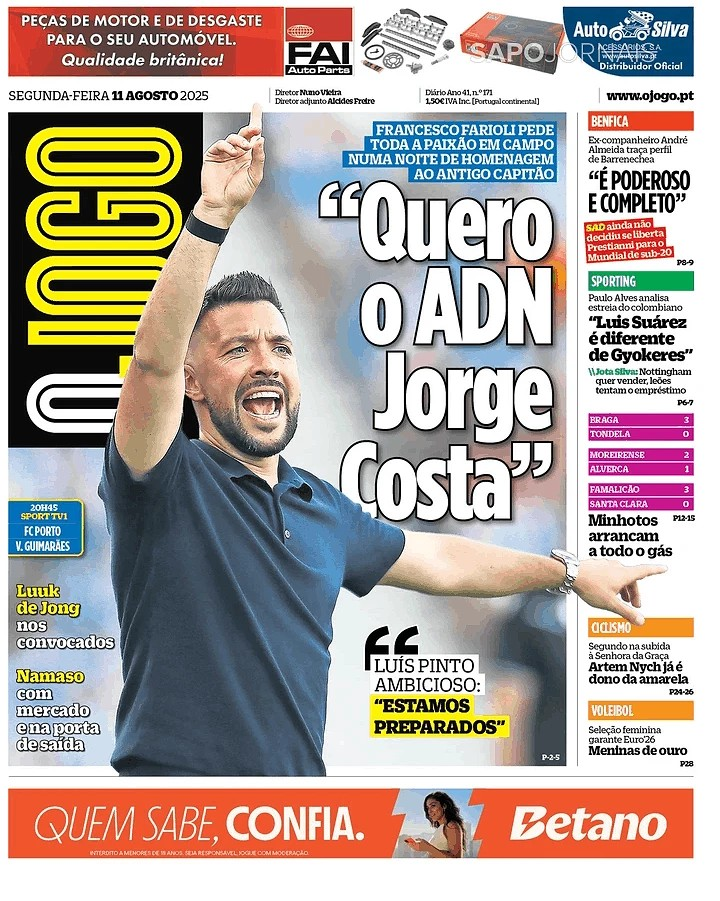 "Quero ADN Jorge Costa" é o título principal de O Jogo, que destaca uma frase forte do técnico Farioli, na antevisão do FC Porto-Vitória SC. Na primeira página, destaque também para uma análise de André Almeida a Barrenechea, médio do Benfica.