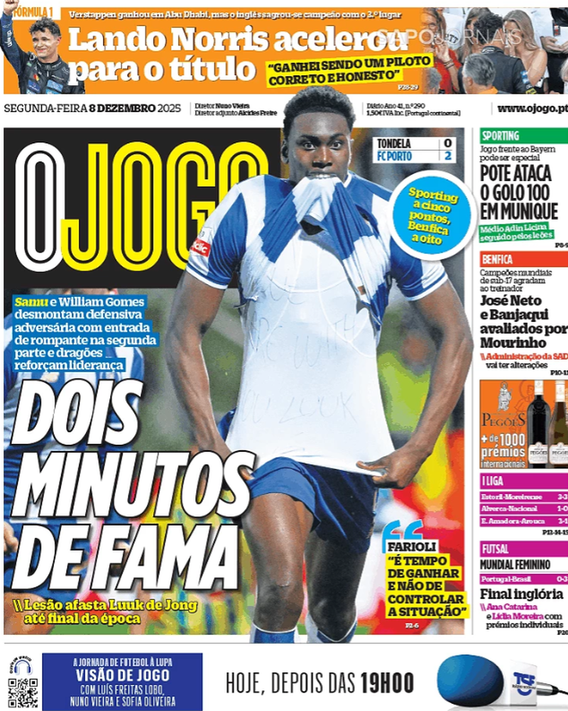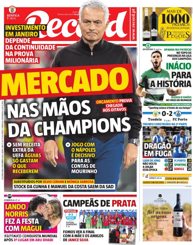 Na Fórmula 1, Lando Norris sagrou-se campeão mundial de piloto após o 3.º lugar em Abu Dhabi. Já o investimento no plantel do Benfica está dependente da continuidade na prova milionária.