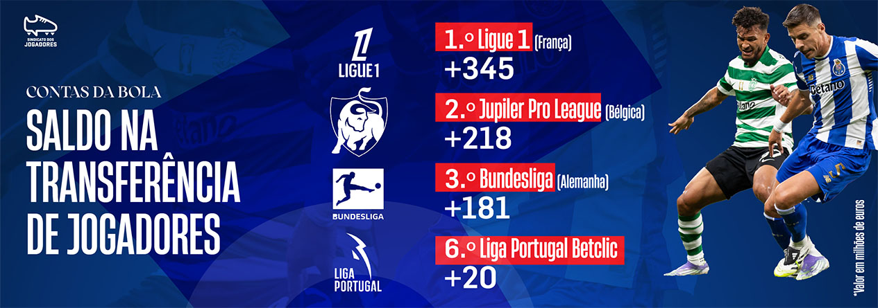 Entre as ligas com melhor saldo, destaque para a francesa, com um saldo positivo de 345 milhões de euros, seguida pela Liga Belga, com um registo positivo de 218 milhões, e pela Liga Alemã, com 181 milhões de euros de lucro. À frente de Portugal, estão ainda as principais divisões dos Países Baixos e da República Checa.