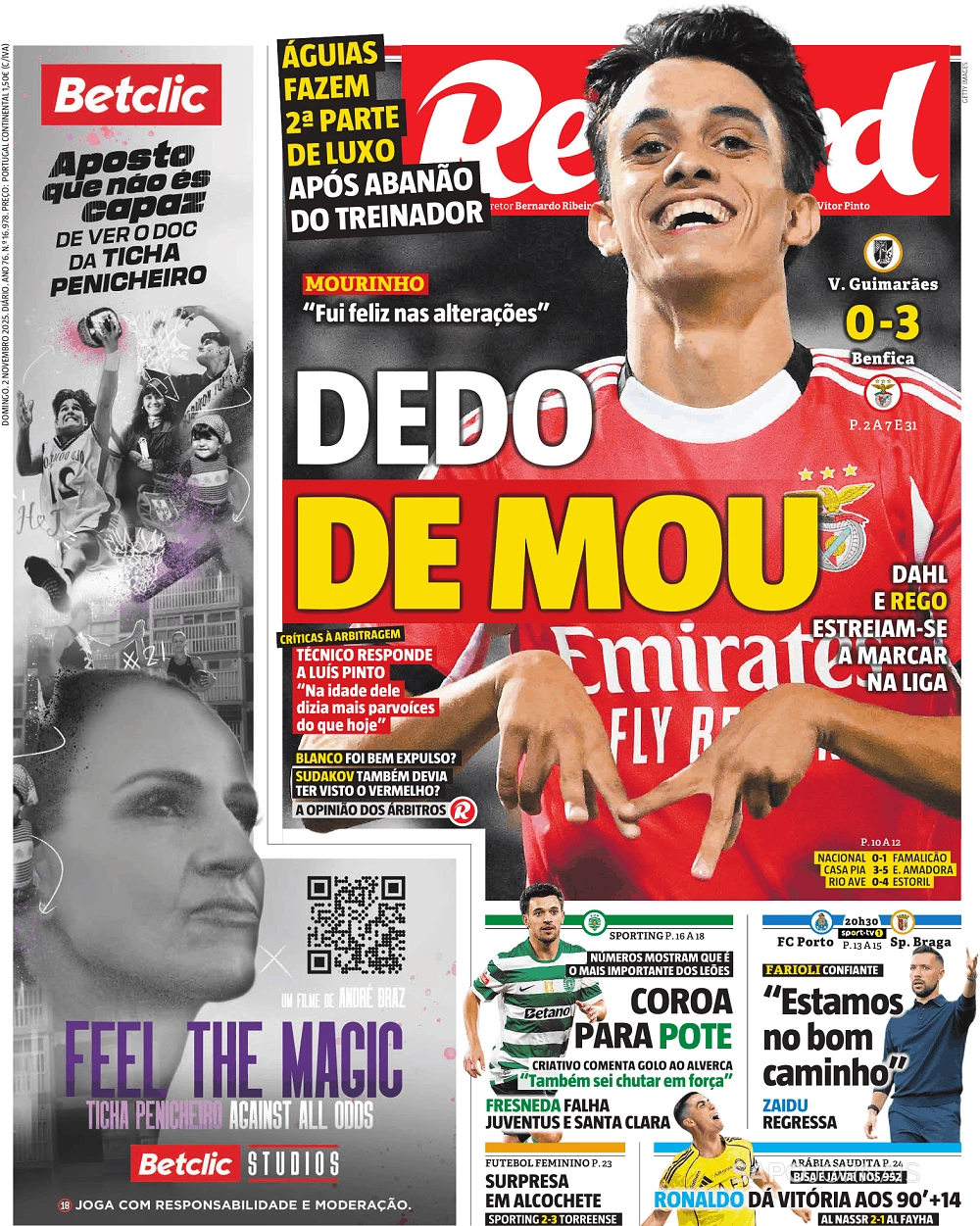 O 'Record' também faz referência ao triunfo encarnado, bem como à vitória do Al Nassr na liga saudita com golo da vitória de Cristiano Ronaldo.