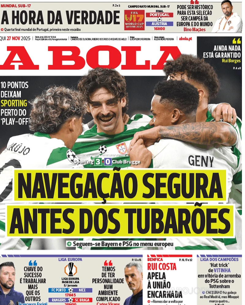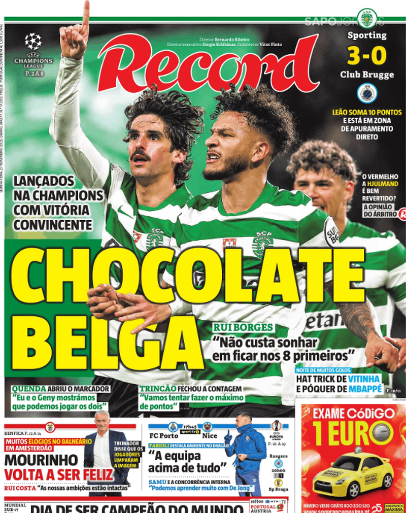 O excelente triunfo do Sporting sobre o Club Brugge (3-0) em partida a contar para a 5.ª jornada da fase de liga da Liga dos Campeões é naturalmente o tema na capa dos jornais.
