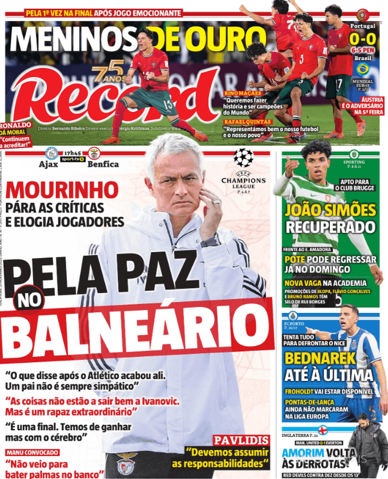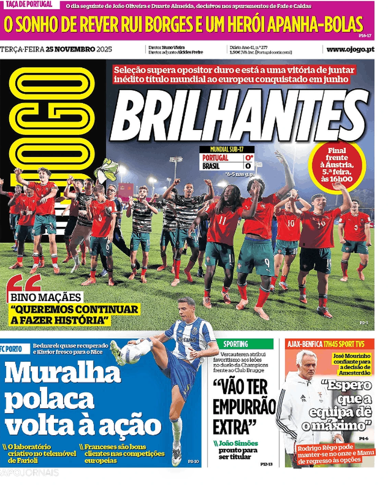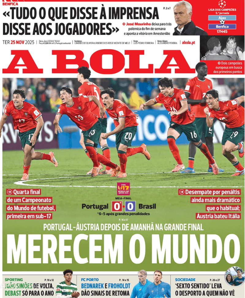 O triunfo de Portugal nas meias-finais do Mundial de Sub-17 frente ao Brasil, nas grandes penalidades, fazem capas nos desportivos desta terça-feira.