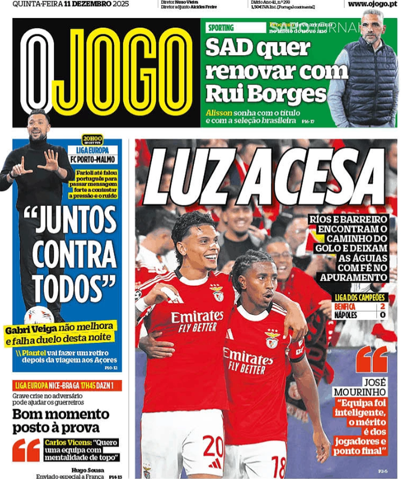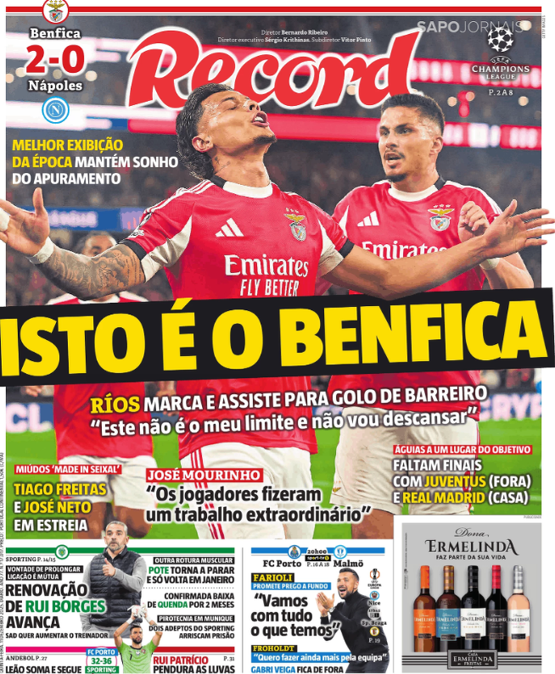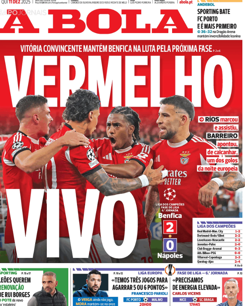 A receção vitoriosa do Benfica ao Nápoles em partida a contar para a 6.ª jornada da fase regular da Liga dos Campeões é o principal destaque dos jornais desportivos.